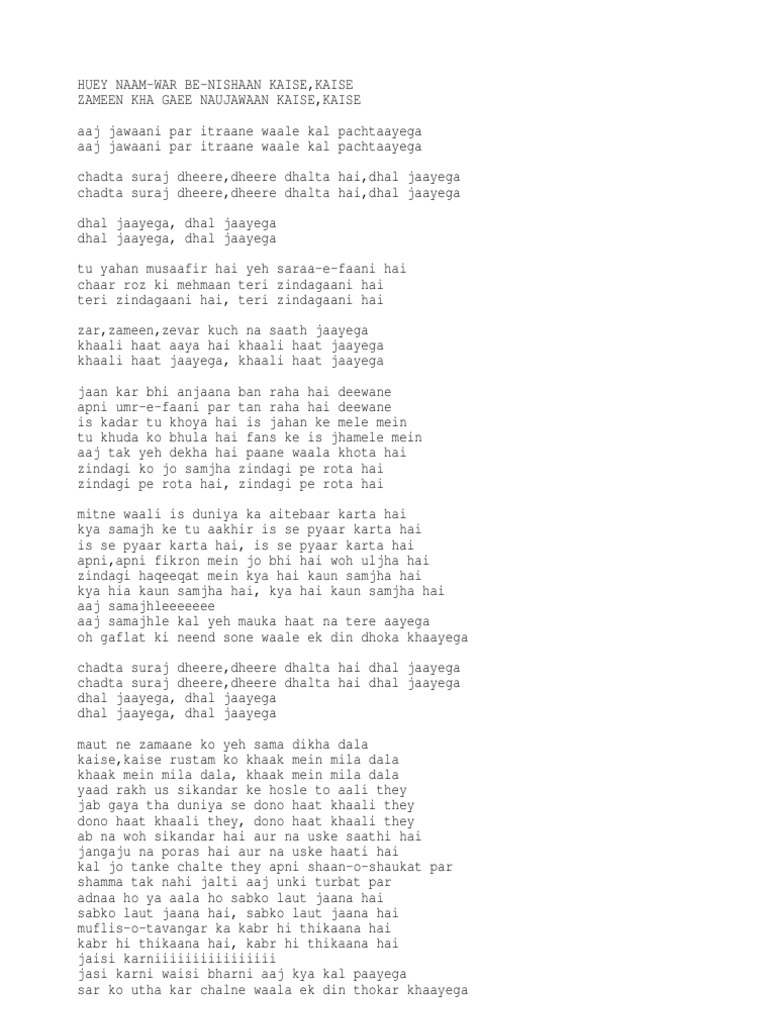 Chadta Suraj Dheere Dheere Lyrics English : Chadhta suraj (2012) singer : Chadta Suraj Dheere Dheere Lyrics English / Maut sabko aani hai kaun isse chhuta hai.